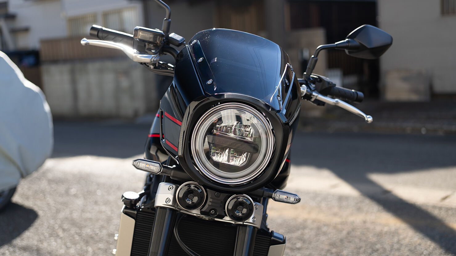 フロント周りにスポーティーな印象を与えるヘッドライトカウル。バイザー部は強度、耐候性にすぐれたポリカーボネート製で、胸周りの風当たりを和らげ快適性を向上。カウル部は高級感のある塗装仕上げです。