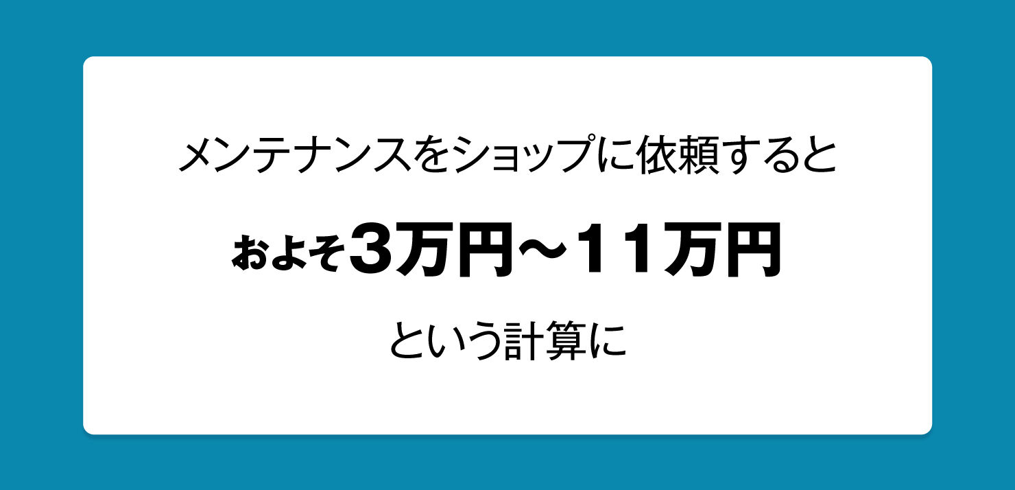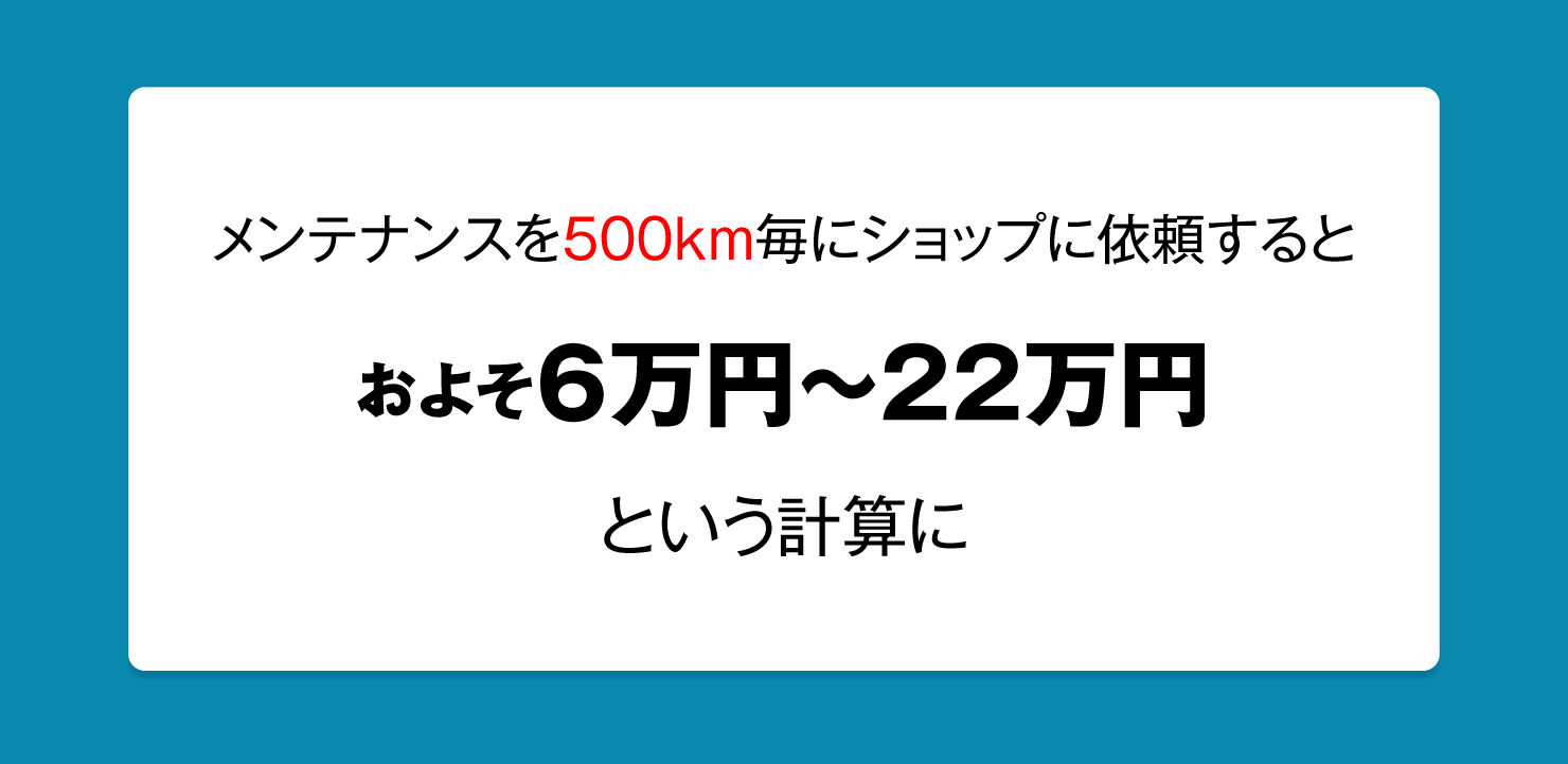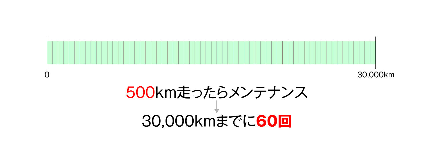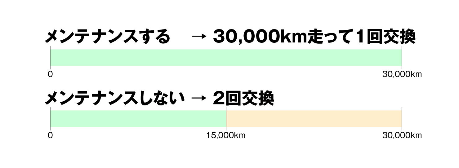 ここからはコスト比較です。メンテナンスをすれば30,000km持つ。しなければ15,000kmで交換。メンテ頻度を1,000kmごととすると、30,000kmまでに30回。
